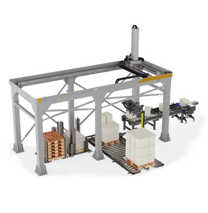 Automated high-speed stacking of pallets, cartons, and product layers with gantry robots.